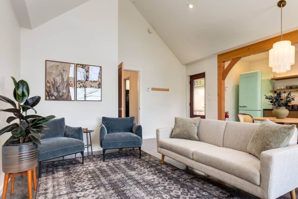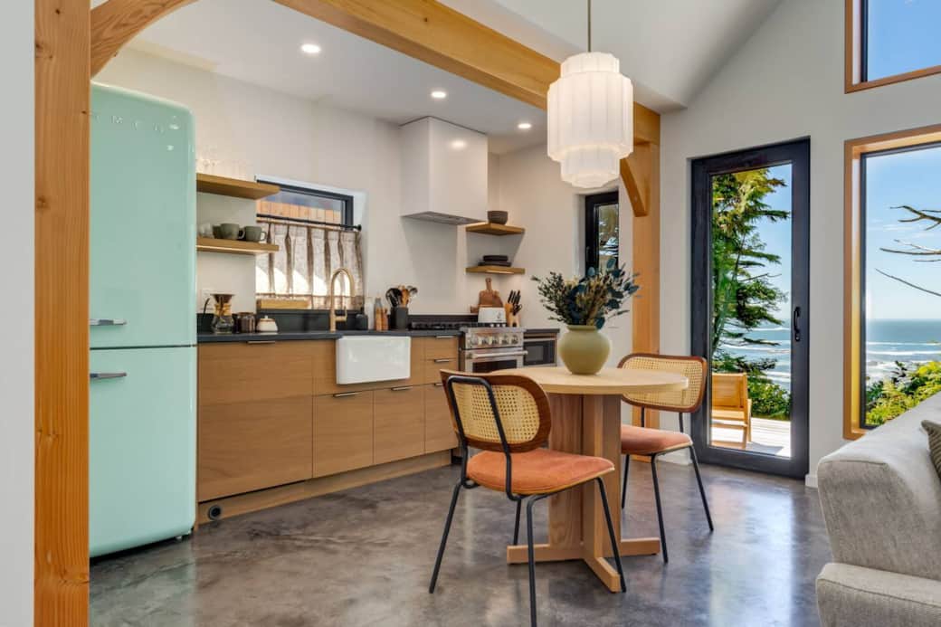 A furnished one bedroom cabin with a full kitchen. The space is comfortable and cozy with a propane fireplace and all of the necessary amenities. Enjoy floor to ceiling windows in the living room with an 18' vaulted ceiling. Sit out on your private deck overlooking the ocean. The cabin feels secluded but is very walkable. Wander the trail and check out beautiful nearby beaches or take a stroll into town.
